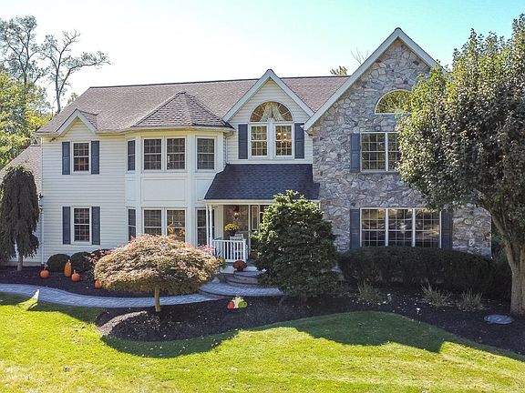 WOW! Beautiful two story colonial situated on .46 acre lot in Montgomery Twp. Many upgrades and improvements were made by the current owner that make this a true turn key property. Proceed to the home from the front curved paver walkway and terraced paver steps onto the covered front porch. Enter into thet two and one half story foyer with open turned staircase featuring custom balusters and newell posts. Formal living room with triple Pella windows and custom window treatments, wood flooring, and custom crown moulding. Formal dining room with bow window and custom window treatments, wood flooring, custom crown moulding and wainscoting, and new upgraded chandelier. The remodeled eat in kitchen showcases Quartz countertops, coordinating subway tile backsplash, Cortec LVT flooring, center island with seating and storage, Stainless Steel Bosch range, microwave,,dishwasher, and disposal. There is recessed lighting in the main kitchen area as well as track lighting in eat in area, under cabinet lighting, and a pendant over the island. There is a pantry for additional storage. Two story eat in area with oversized Paladium window for lots of natural light. The kitchen is open to a family room with wood burning stone surround fireplace with hearth and mantle, wood flooring, ceiling fan, and an upgraded Pella sliding door with side panels that leads to the expansive outdoor living space. A powder room and coat closet complete the first floor. The second floor offers an owners bedroom with wood flooring, vaulted ceiling, ceiling fan, triple Pella windows with overtop half moon, and walk in closet with built-ins. There is a master ceramic tiled bath with soaking tub, stall shower, double vanity with granite, and skylight. There are three nice sized bedrooms located on the opposite side of the home providing privacy to the owners bedroom. They feature double closets, ceiling fans, and carpet. The recently remodeled tiled hall bath with tub/shower combination and laundry room with 1 year old washer and dryer completes the second floor. There is a partially finished carpeted basement that offers additional living space as well as lots of unfinished storage. Plenty of parking with the oversized two car side entry garage, long driveway, and off street parking The back of the home is an extraordinary entertaining space with a two tiered E P Henry paver patio, powered retractable awning over the eating area, gazebo with electric, propane fire pit table and chairs, waterfall fountain, and diverse mature landscaping providing a tranquil setting.