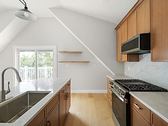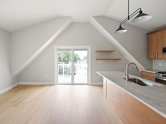 Penthouse 3-bed, 2-bath apartment combining style and convenience. Fully renovated with soaring ceilings, recessed lighting, and a bright open living/dining area ideal for entertaining or relaxing. The chef-inspired kitchen features quartz counters, stainless appliances, and custom wood cabinetry with floating shelves. Two full baths showcase contemporary tile and sleek fixtures. Three spacious bedrooms provide generous closet space. Enjoy central A/C, efficient gas heat, and in-unit laundry. One private parking space included. Just minutes to Constitution Beach, Wood Island Blue Line, and quick highway access for an easy commute to downtown Boston.