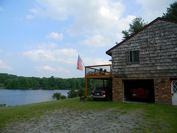 LAKEFRONT HOME ~~ 2+ ACRE PARCEL ~~ One of a kind 3 bdrm, 3 bath lakefront home w/ 284 ft. of frontage on secluded mtn lake w/dock, great for fishing, swimming & small boats. Feats: The great rm has a glass facade,custom built oak cabinets in kitchen, living room with fireplace, electric skylights, new expansive deck perfect for entertaining, family room w/sliders to Lake, garage, & more. Pride of ownership evident thru out. Minutes to State Game Lands, 3 other Lakes & ELk Mt.(skiing