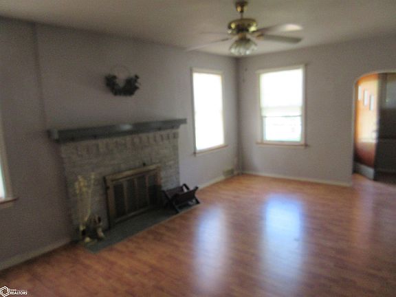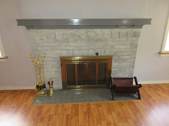 Cute 2 BDR brick bungalow with original hardwood floors in both bedrooms and the dining room. The living room is very large (20' x 12') with a working fireplace and features newer laminate flooring. Just finished, NEW concrete steps going to the home. The main floor full bath has a low-rise tub for easy access and the full basement has a half bath. Nice access to the tuck under garage from the basement. Wide-open walk-up attic for seasonal storage of your goods. There are ceiling fans in every room (except the bathroom). Nice, clean home, 2 blocks from the downtown area. By appointment.