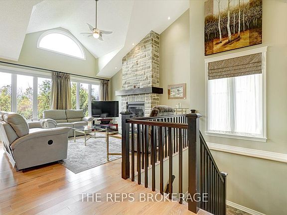 Private double drivewayManicured front gardensLarge rear yardFull walk-out basement designFloor-to-ceiling stone fireplaceImpressive vaulted ceilingsPot lights on dimmers