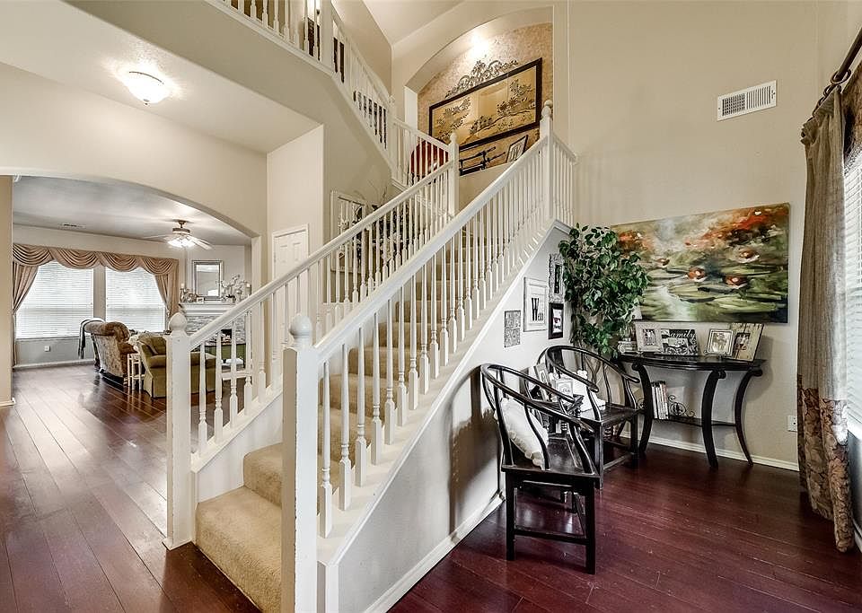 Quiet cul-de-sac street with a covered front porch! The back yard overlooks a heavily treed green belt and is perfect for entertaining guests with a huge patio. The master bedroom has a double see through fireplace with brand new carpet! Upstairs you'll find a loft for a playroom or office nook and a flex room wired for surround sound that can be used as a fourth bedroom or media room! The roof is only three years old and the exterior and interior paint is less than two years old. Close to the highway, restaurants and shopping... this house is a must see!