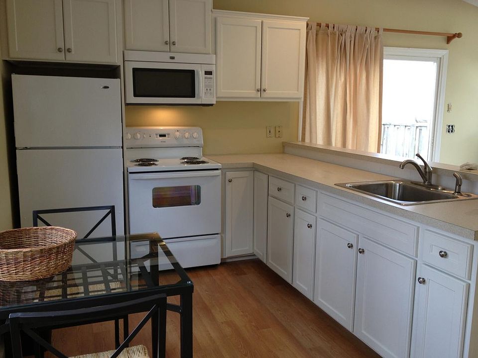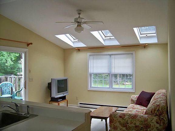 Spacious, sunny apartment features a separate entrance from the main house, a private deck, and off-street parking. The living room features a vaulted ceiling with skylights. Located 1 mile to downtown, and 2 miles to beaches, convenient to I-95 and the Shore Line East commuter train. Furniture includes queen sized bedroom set, couch, kitchen table and chairs, and more. Kitchen includes microwave, fridge, stove, cooking pots, silverware, dishes, etc. Furnishings are flexible - if you have your own pieces to move in, we can accommodate. Washer and Dryer in apartment. No smoking or dogs. $1000/mo + utilities. Security and last month's rent due at lease signing. First month's rent due on move-in day. Available December 15th. Renter pays for utilities (electric, cable, internet.) Included with rent: Garbage/Recycling collection, snowplowing of driveway, yard maintenance.