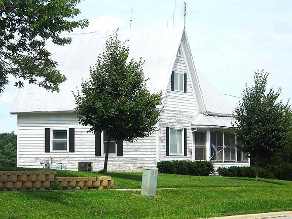 Three bedroom, two bath home with over 1700 square feet has open floor plan and is on 2.63 acres on the edge of town. Owner has plans to paint exterior immediately. Kitchen is attractive with wood cabinets and a nice island. Dining room and kitchen are combined to provide the great room....... Appliances stay...there is a water softener and a fairly recent furnace with central air. Home has metal roof and a cellar with cement floor. Front porch is enclosed with glass and screens and provides a nice view of front of property Property is close to grade school and has city Water and sewer. There are two outbuildings and aprox two acres of pasture that provides hay currently being mowed and used by a local farmer. There is electricity in both outbuildings and there was once water running in the old milk house. There is a frost free hydrant hookup in the pasture field that was used to water animals. There is no longer a farm fence around that pasture. Interior needs dated carpet replaced.