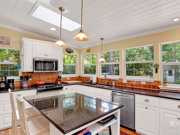 This cottage located in the fruit and nut district, just blocks away from the Mobile Bay and downtown Fairhope, has been renovated over the last few years with a new fortified roof in 2023, and plumbing & electrical updates in 2011. Tons of natural light comes in through the skylight and strategically placed windows giving this cottage an open and airy feeling. The cottage has a large open kitchen with beautiful white custom built-ins with massive amounts of storage, stainless steel appliances, and beautiful black granite countertops. Quite comfortable with 1 full bedroom and a 2nd bedroom being used as a home office, and there are 2 full baths. This home has gorgeous hardwood floors, and tile flooring in kitchen and wet areas. The back of the house has an amazing kitchen, dining, living open area with windows all along the back, so you can actually have 2 living spaces since this is an over-sized room. Outside storage building used to store kayaks outside with additional inside space and this cottage has a nice fenced in back yard, not too large but good size with an outdoor living area with table and chairs on a large freshly painted wooden deck across the entire back of the house, including a natural gas grill which is a great outdoor space for entertaining! FLOORING NOTE: There is no carpet in this home, the flooring is Hickory hardwood, tile is marble, slate, with ceramic in utility room, and Saltillo "Mexican" tile in the kitchen/den. Parking for property is on a double rock driveway. This property has an irrigation systems that is metered separately than home which is with Fairhope Utilities, AT&T wireless for telephone, and U Verse for internet, property is covered by Arrow for termite contract & mosquito control; approx. monthly cost of utilities runs about $351/month, plus homeowner's insurance around $810/year. Call your favorite Agent today to schedule your private viewing. Buyer to verify all information during due diligence.