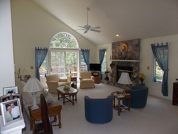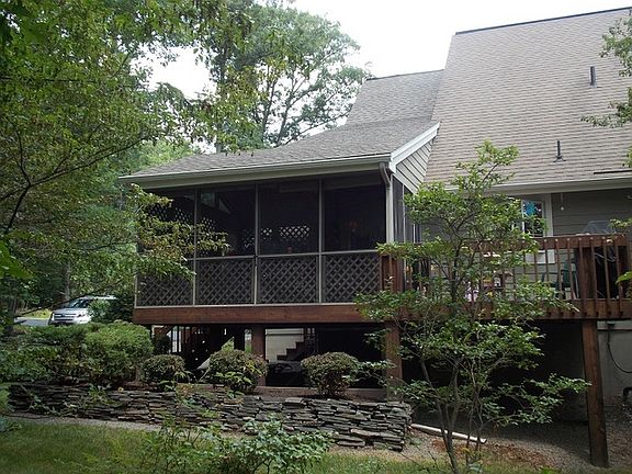 Located on Golf View Lane this Callaway design enjoys the private setting of a corner lot. With a spacious screen porch and two open decks, you will enjoy the wooded surroundings. The country kitchen enjoys hardwood floors and exposed beams. This open floor plan has vaulted ceilings, a stone fireplace and palladium windows. The 1st floor master suite enjoys a walk in closet and large bath with whirlpool tub and separate shower. The finished basement offers lots of flexibility to the new owner
