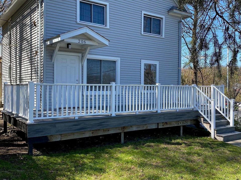 Available 07/01/2021 Remodeled 1st floor, 1 bedroom apt with a beautiful front deck. Modern Kitchen with Stainless Appliances, Center Island with lots of cabinets below. Kitchen is a modern open space, ideal for entertaining. Laundry w stylish sliding door that hides the stacked wash/dryer included w apt. A backdoor w covered porch leads to private off street parking. Just off kitchen is a large living and dining area with plenty of windows that look out to the deck. All windows include new blinds and screens. Hardwood floors tie in the whole floor plan. Large Bath Room w new tile and fixtures next to a cozy bedroom completes this centrally located Clarks Summit Apt.