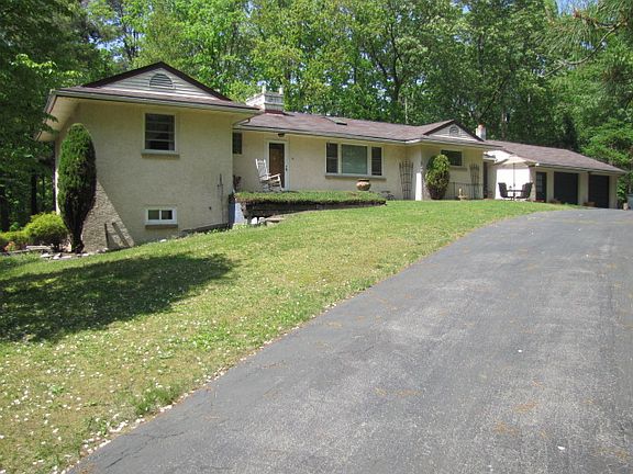 Masonary Rancher with walkout basement and oversized 2 car garage: 4 Bedrooms, 2 baths, 2 kitchens, dining room, living room with vaulted and beamed ceiling, family room, laundry room / Pantry, 2 large stone fireplaces, 2 patios & outside fire pit. Located in The Mountainview Village Section of Pine Hill- on a hill in .64 acre wooded lot adjacent to Trump National Golf Club