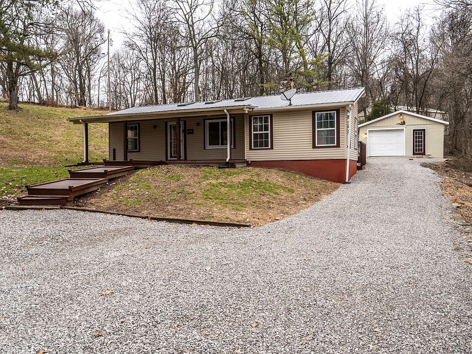 8+ Acres of beautiful land. Very private setting and only a couple of minutes to I-65. 24'X36' Metal shop plus a 20'X30' detached garage. Move in ready home with new vinyl plank flooring throughout the entire home, New white painted trim, wood wrapped windows, freshly painted interior, and new tile surround tub shower combo. Spacious kitchen with stainless steel appliances. Wood fireplace and mini split for heat and A/C. Enjoy this great property on the large covered front patio and huge back deck. Easy to maintain and durable metal roof.