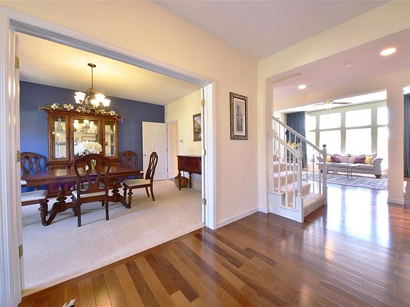 IMPRESSIVE 1.5 sty w/ 4-beds (each w/full bath), 5-baths, 4,222 sq ft of living space w/3-car garage on one of the largest lots in the development. GORGEOUS Brazilian cherry wood floors flow from entry foyer into Great Rm, Kitchen, Breakfast & Hearth areas. Floor to ceiling rear wall of windows in Great Room w/built-in's & vaulted ceiling create an open, airy space. It flows naturally into large kitchen w/custom cabinetry, commercial, Thermador 6-burner gas range w/range hood, double ovens, breakfast bar, stainless appliances + built-in refrigerator, opening to large eating area & Hearth rm w/gas fireplace & plantation shutters. Main floor laundry, 1/2 bath & large master suite w/walk-in closets, bath w/double sink, whirlpool tub & separate shower-all on main level. 2nd floor design is unique w/private bed & full bath anchored on separate level + a Den, Family Rm & 2 additional beds w/ full bath's. Basement is ready to finish w/egress windows, slider and rough-in already constructed.