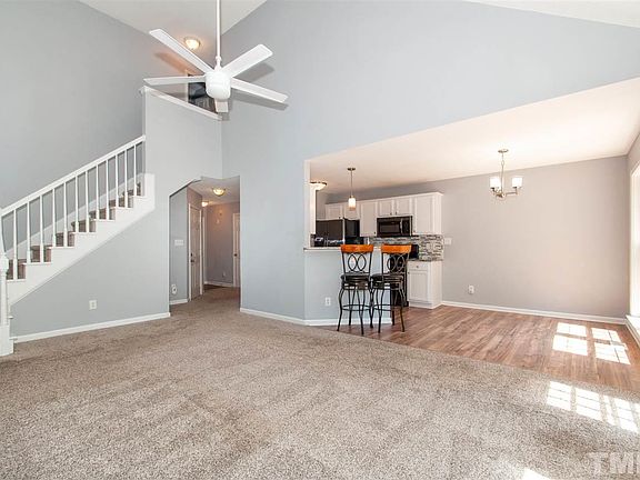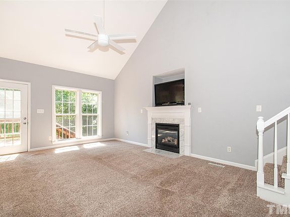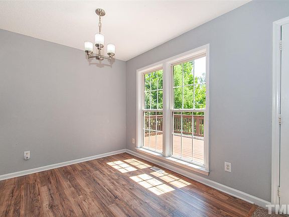 Move in ready open flr plan has freshly painted interior. Lrg liv rm w/cathedral ceiling, gas log frpl, built-in entertainment niche & access to the oversized deck w/new flring. Cook friendly kit has granite counters, tile back splash & gas stove. 1st flr mstr w/his/hers WIC's & private glamour bath. 2nd flr has 2 bdrms, full bath & spacious bonus rm w/WIC. Private wooded backyard has firepit & garden areas & tree house. Lot backs to comm common area. Conv to Downtown Knightdale, parks, shopping, & I-540