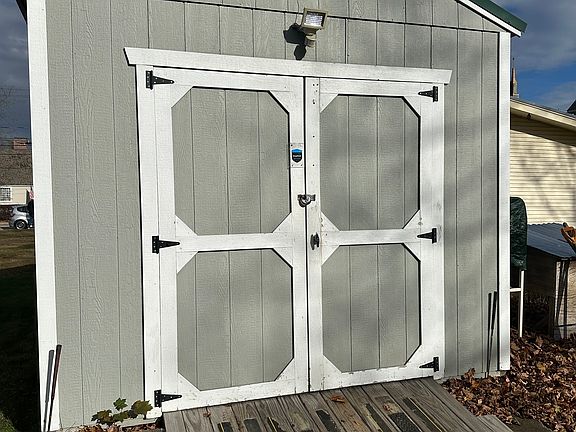 The exterior includes a large lot with a driveway for convenient off-street parking. The backyard offers ample space for relaxation and entertaining, complete with an oversized shed, a covered deck, and a fire pit.