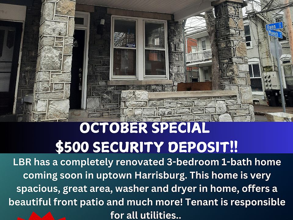 LBR has a completely renovated 3-bedroom 1-bath home available now in uptown Harrisburg. Freshly painted with new plank flooring/carpeting throughout. New furnace with forced air A/C. New kitchen with granite countertops and all new appliances. New custom tile bathroom. New washer and dryer. Pictures and Video tour coming soon. OCTOBER SPECIAL $500 SECURITY DEPOSIT!! Tenant pays all utilities. Pets are permitted with breed and weight restrictions for additional monthly fee. Application requirements - 550 credit score, 3x income, good landlord reference. Anyone 18+ must apply separately. *Unpaid eviction(s) and/or judgement may disqualify the application.