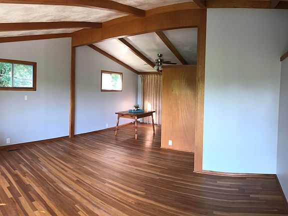 A perfect little package of mid-century modern design in excellent condition. Stunning original wood floors throughout main living and bedroom areas. Updated kitchen and bath. Open concept with light flooding in from the floor to ceiling windows in the living area. Utilities in a concrete walled basement that provides ample additional storage. New roof in April of this year. Covered patio that leads to a nice sized back yard with a garden spot.