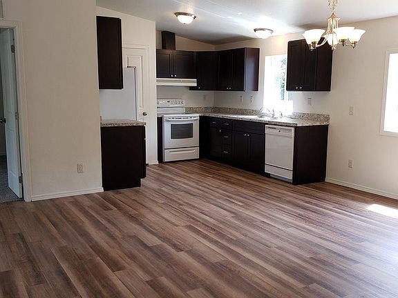 Freshly remodeled and updated, this LIKE NEW 1998, 3 bedroom, 2 full bath home looks great. It includes a den which could be converted into a 4th bedroom. Newly updated features include... New interior and exterior paint, new laminate flooring and new carpet, new kitchen cabinets and counters, new sink and dishwasher and more. Vinyl windows, comp roof, storage building and fully fenced with drive in gate. 50'X100' lot which is included with the home. Title has been eliminated and the home should finance as real property. Sellers hired professional contractor for this remodel and it shows. This is a quality remodel.
