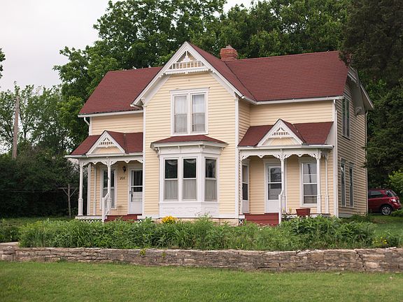 A 1901 two-story Victorian home with two front porches, exterior recently painted. Home is in great shape! 1,580 square feet on 1.2 acres. Three bedrooms, one of them with new carpet. Kitchen remodeled in 2012, including new appliances. Two full bathrooms, recently remodeled. A mud room, laundry room and a storm cellar that measures 10.5 ft x 11 ft. Central heat and air conditioning. An attic fan cools the upstairs bedrooms most summer nights! The freshly painted detached two-car garage and attached multi-use space (workshop or studio / storage / chicken coop) measures 36 ft x 27 ft. The back yard also features a working outhouse! Well-maintained lawns with apple, peach, cherry and apricot trees. Plus lots of perennials!!! The house is located on the north edge of town between the BNSF tracks and National Scenic Byway K177 (Reed Street). This wonderful home was built in 1901 by banker McKee of the Matfield Green State Bank.