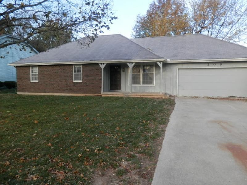 Great investment property! This terrific REO home has lots of potential; it's just waiting for your finishing touches. The 1-story, brick and wood exterior home is in a great neighborhood. Features include a front porch and an attached, 2-car garage. Inside, you'll find a formal dining room and the nicely-sized bedrooms. The living room boasts a brick fireplace and wood panel walls. You'll love the large, fenced-in backyard with a nice patio. The house also includes a basement. Schools, highway access and shops are in close proximity. The property at 206 N Woodson Dr, Raymore, MO is a residential, single-family, detached property with 3 bedrooms and 2 bathrooms, built in 1975 and 1,385 square feet.