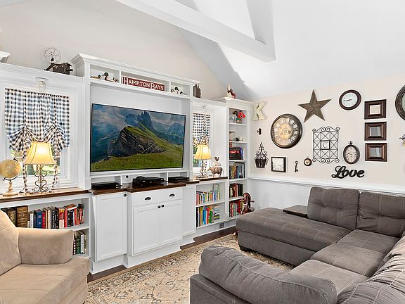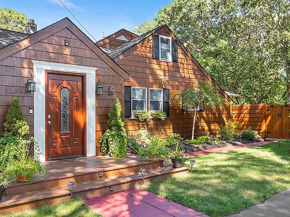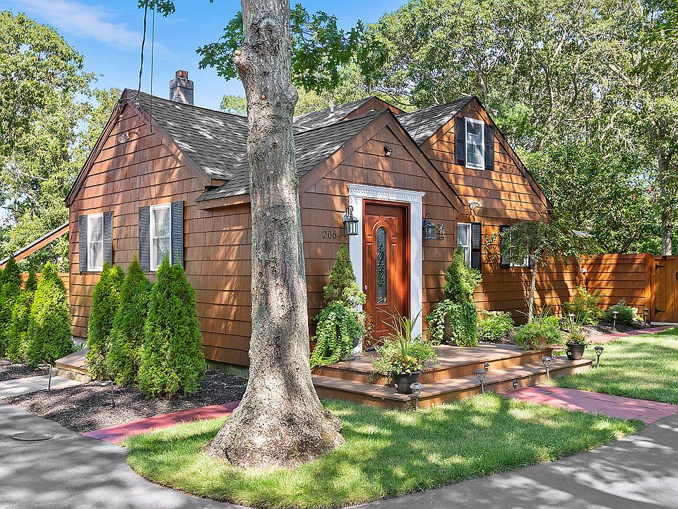 This turnkey cedar-shake home rests on 0.46+/- acre on a private corner lot at the end of a quiet cul-de-sac in Hampton Bays. Enter the home through the lovely foyer, leading to a large living room with wall-to-wall library shelves, a high ceiling and exposed beams. The pristine eat-in kitchen features new stainless steel appliances, Corian countertops, a spacious pantry, and opens to a lovely dining area. The 1,350+/- sf home offers three bedrooms and two full baths, including a second-floor en suite master with walk-in closet, wainscoting and beautiful moldings, and a first-floor guest suite with walk-in closet and built-in bookshelves. The outside deck area can be accessed from the kitchen, and overlooks the gorgeous yard with landscaping, solar lighting, an irrigation system, and offers room for a pool. Additionally, there is a charming cottage, featuring one bedroom, one bath, a kitchen and dining area, built-in bookshelves, exposed wood beams with lights, high ceilings, and lots of windows allowing in ample light. There is additional room for storage in a loft area above. This picturesque property is located just moments from incredible restaurants, marinas, and bay beaches.
