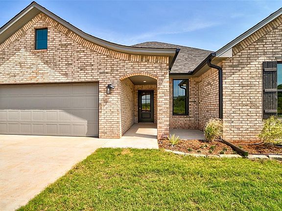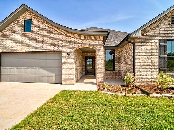 Completed New Construction in Trails End, a new Greg Brown development in North Rock Creek Schools. Excellent location for OKC commuters - 29 min to Tinker & 34 min to Bricktown. The arched front porch entry is stunning in this 4 bed, 2 bath home. Open living, dining & kitchen. Kitchen has a large island, lots of counter space and a walk in pantry. The owner's suite has double vanities, an oversized walk in luxury shower and walk in closet. The living room features a new state of art touch stone fireplace with a remote that allows a variety of options. Home is completely sodded with a landscape package. Wood-like tile is in all living areas and bedrooms are carpeted. At Shawnee Mall and Kickapoo, go north to the Trails End Addition. A new home gives you peace of mind with all new appliances and mechanical features and includes a 1 year Builder's Warranty. Fenced back yard.