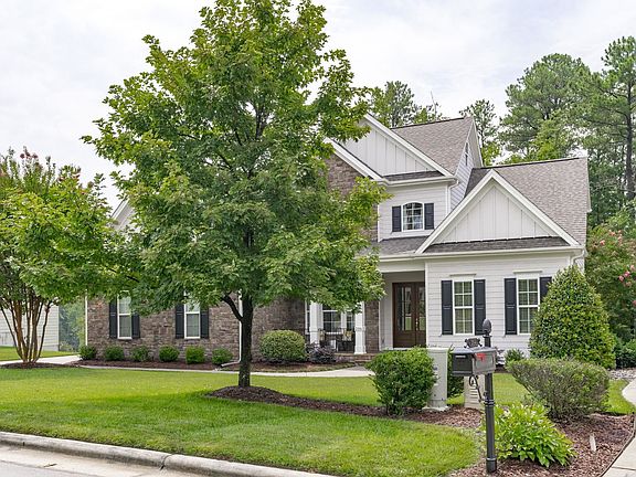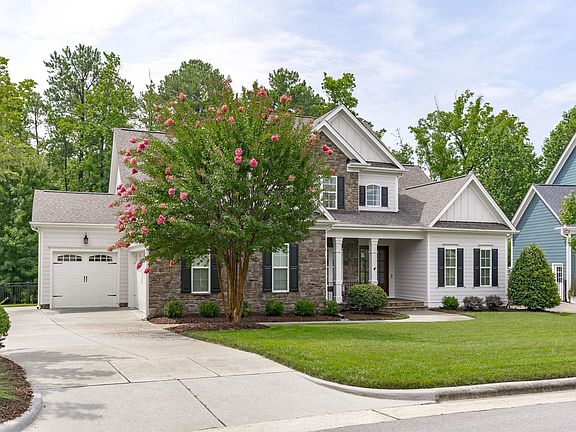 Stunning Cameron Pond home featuring 4 beds and 3 full baths! Open living spaces including large kitchen with island bar + butler's pantry, breakfast room, sitting room, dining room and cozy family room with gas fireplace. 1st floor boasts primary bedroom suite and guest suite. 2nd floor features 2 more large bedrooms, bonus room, flex room and tons of storage. Work smarter not harder with Google Fiber. Relax on the rocking chair front porch or enjoy entertaining on the screen porch which opens on to private fenced back yard with patio and stone fireplace. Cool off at the community pool or visit one of the many parks nearby for pickleball, baseball, basketball, tennis and greenways/trails for hiking, biking and more! Close to 540/RTP, shopping, dining, entertainment & more!