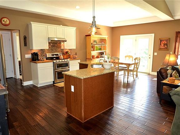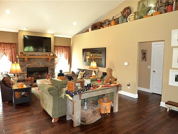 Like New Craftsman Style stone & sided Ranch! Set on 12.8ac surrounded by 150acre of woods on 1side & 50acres of farm on another, paths, barn w/stalls, water&electric, chicken coop, smoke house, tree stand, orchard of pears, plums, apples, blueberries & row of pines. Very well built home w/pillared covered front porch, totally open floor plan. Vaulted entry area w/dark distressed wideplank flr. Open area, now used as entry, is din rm. 1st flr den has door & has been used as BR4. Vaulted great rm boasts wideplank hardwood, 2ST stone fireplace & ceiling fan. Granite center island kitchen w/white Craftman style cabinets w/crown, commercial style range hood, decorative backsplash w/pot filler, dbl stainless convection oven & door to deck & patio w/fire ring. Master suite w/walk in & private bath w/lrg separate soaking tub & shower. 2spacious BR share a well-appointed hall bath. Huge walkout lower level is plumbed for full bath. In&out French drains, 400AMP service, 10yr structural warranty
