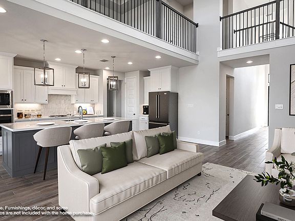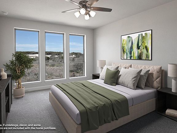Two-story entry extends past a guest bathroom to the family room, kitchen and dining area. Spacious two-story family room with 19-foot ceilings and sliding glass doors. Island kitchen offers built-in seating space and a walk-in pantry. Generous dining area with a wall of windows. Primary suite features a wall of windows. Primary bathroom hosts dual vanities, garden tub, separate glass enclosed shower and a large walk-in closet. Guest suite with full bathroom and walk-in closet just off the kitchen area. Second floor features secondary bedrooms, a full bathroom and a game room. Extended covered backyard patio. Utility room just off the three-car garage. Representative Images. Features and specifications may vary by community.