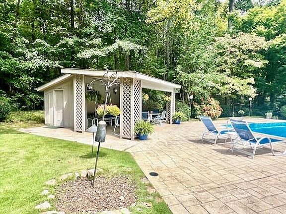A desirable cul-de-sac neighborhood and a lovely pool/patio/deck/cabana area awaits the lucky homebuyer who takes on the work needed for new carpet/paint, and some cosmetic upgrades in this handsome home. HUGE living areas and the biggest en suite bed/bath/ gas fireplace, and walk in closet on the main level one can envision. The kitchen is meal prep ready with 2 refrigerators, a granite topped island, 2 ovens, and 2 big pantries. A large mountain stone wood burning fireplace in the spacious living room is flanked by a wall of windows . There is access to the rear deck thru the dining room doors and out the sunroom adjoining the kitchen. More storage area than a homeowner could fill, located in the full basement and unfinished attic wrapping around the 2 beds and full bath upstairs. Plenty of parking on the parking pad and 2 car attached garage on the main level. This is a beautiful 1.32 acre lot of blooming trees and shrubs with wooded privacy in rear.