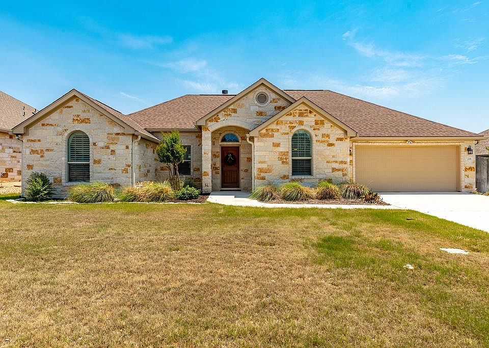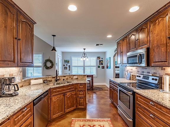 CRABAPPLE GROVE - Beautiful native stone home built by Canseco Custom Homes. Easy living open floor plan with concrete stained flooring and split bedroom design .Kitchen overlooks great room and has a kitchen bar plus breakfast room and pantry. Lots of cabinets space, granite counters and stainless steel appliances. Great room has cathedral ceiling and floor to ceiling wood burning fireplace. Spacious master bedroom suite features coffered ceiling, double vanities, jacuzzi, walk-in shower and walk-in closet. Separate dining room with lots of natural light. Enjoy sitting on the covered porch with a spacious fenced back yard.