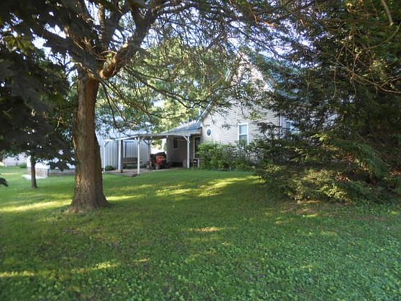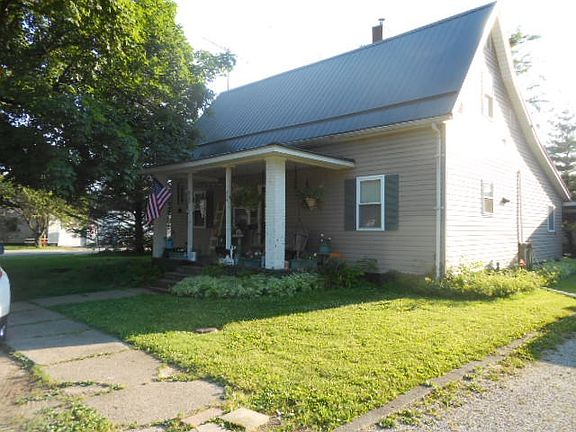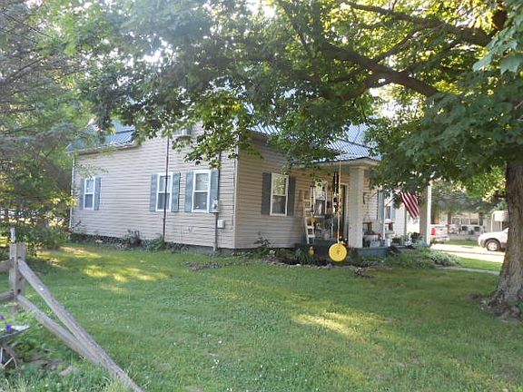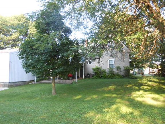Large double corner lot with 4 bedrooms, 1 bath, metal roof, 2 car detached garage with covered front porch and patio. This home has a full basement and includes a refrigerator, stove, dishwasher, and freezer.