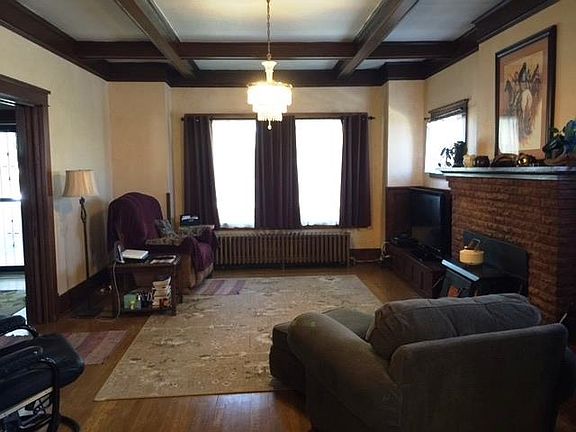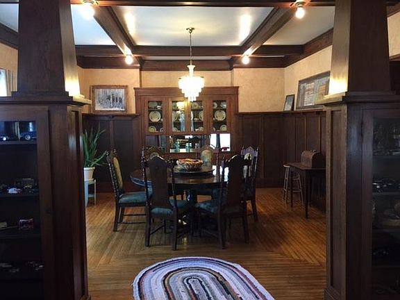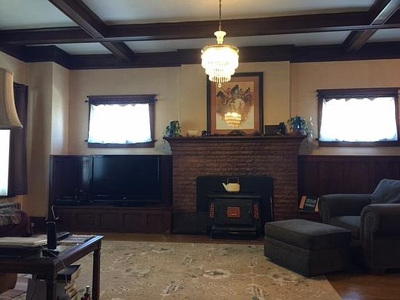 Bright & spacious 5 bdrm, 2 bath craftsman style home on a large corner lot. Hardwood floors & beautiful woodworking throughout. Many built-ins & period features. Fireplace in the living room. Master bdrm has fireplace and French doors to private porch area. Den/office area on the first floor could be extra bdrm. The large oversized 2-car detached garage has a shop area & wood pellet stove for heat. Basement finish includes family room, 2 bdrms (non-egress). Partially fenced yard w/underground sprinklers.
