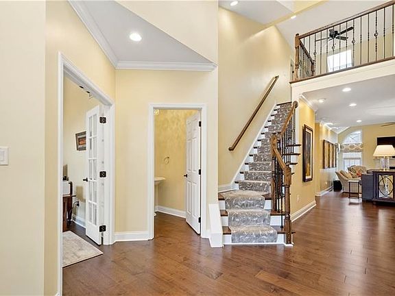 A cut above the rest and better than new, this well-appointed, impeccably, maintained 4 bedroom 3.5 bath patio home boasts a bright and open floor plan. hardwood floors, high ceilings, high-end kitchen with stainless steel appliances, floor to ceiling cabinetry with roll-out drawers, soft close cabinets, granite counters, backsplash, under cabinet lighting, contrasting center island for seating, beautiful first-floor master suite with jaw-dropping walk-in closet, granite vanity tops, the second floor features a spacious loft or home office, gracious bedrooms, abundant storage, the lower level is completely finished with a walkout game room with a fireplace and gorgeous custom built-ins, two craft rooms, or additional bedroom space, full bath &even more storage! You will absolutely love the screened porch for outdoor entertaining, relaxing & extra living space three seasons of the year. Best of all, there's no more grass to cut or driveway to shovel but time to enjoy the community pool.
