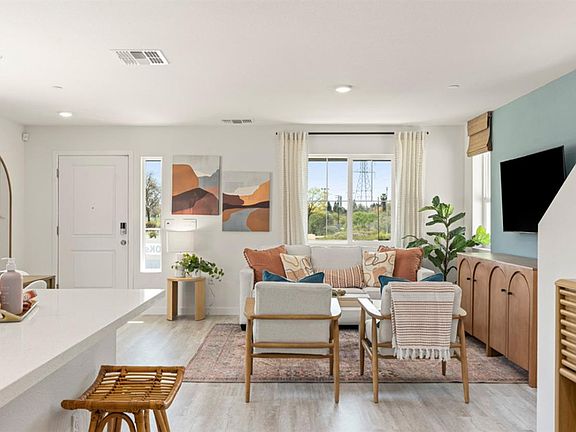 Gated community. Brand new solar farm home offering a two-story alley floor plan with 3 bedrooms, 2 bathrooms, and a 2-car garage. Features include a spacious open-concept great room, plank flooring all downstairs, carpet upstairs, quartz counter tops and shaker-style cabinets, appliance package and two inch faux wood blinds. vinyl plank flooring all downstairs, carpet upstairs, quartz counter tops and shaker-style cabinets. Home features a Connected® Smart Home System which includes a programmable thermostat, door locks, smart light switch and touchscreen Smart Home control device when the system is connected to the internet. Please note interior photography is from the model complex.