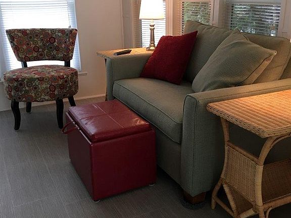 Well appointed 2005 Park Model tucked away in Old Stagecoach Resort. Bright and airy, full size stainless appliances, 1 bedroom plus the green loveseat in the living room opens up to a bed for additional sleeping, as well as the couch in the air conditioned Florida room. Short walk to clubhouse or bath house. There is also storage area for boats with reservation. Affordable and almost new vacation home. There is also a playground for children. Yearly fee of $870 includes water, septic, common amenities including clubhouse, bath house with laundry facilities and beautiful pool and trash pick up. Within minutes of beaches and shore attractions.