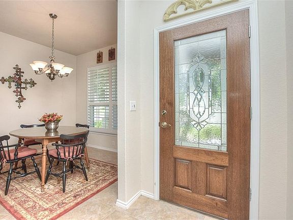 Hugging a nature preserve, this Sun City Texas Bayberry Garden Home also views another greenbelt, just across the street, granting a pleasing vista from the twin windows of the tiled Dining, treated with custom plantation shutters, seen throughout much of this lovely home along with upgraded lighting and fans. Tile floors begin at the Gallery Foyer and blanket the living areas, including the Open Kitchen with upgraded cabinets and Corian counters. Year-around lawn care is included in the annual dues.