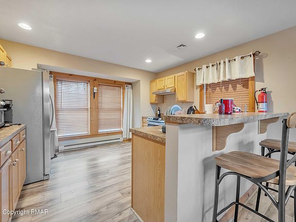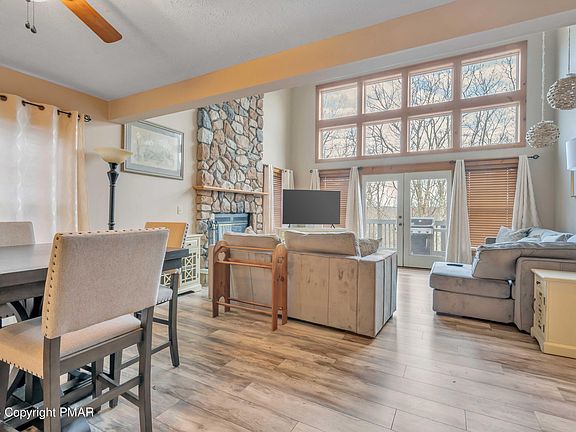 This spacious townhouse in the heart of the Pocono Mountains, offers a perfect blend of rustic charm and modern comfort. Inside you will enjoy an open-concept layout with vaulted ceiling and large windows that flood the space with natural light. The living room has a stone fireplace, perfect for chilly winter nights. Large kitchen w/stainless steel appliances. The townhouse includes four bedrooms and four bathrooms. A finished basement offers additional living space. The back deck provides a private outdoor oasis, overlooking a wooded area that ensures peace & privacy. Located just minutes from Camelback Resort and within one of the Poconos premier communities.