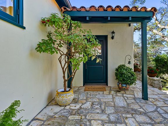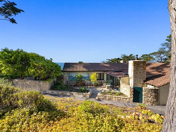 This beautiful and magical property enjoys Pacific Ocean views framed through the trees with no homes or utility lines to obstruct the views. The 1.58 acres are perfectly sited, fully fenced, and gated for your privacy and serenity. Enjoy the charming hidden gardens/patios, surrounded and protected with Carmel stone. One garden can be reached through the Sunroom/Breakfast room and the other one, with a beautiful fountain, can be reached through the Master Bedroom. There is a waterfall to delight your company as they approach the entrance to this home. You might feel you are in a European country with the Old World Charm that this property exudes. The master suite has a separate sitting room. The home has exquisite interior touches not found in many homes. It is only minutes away from downtown Carmel and is located in the coveted Carmel School District. There is a backup generator and the Property Association members also enjoy access to Mal Paso Canyon and Yankee Point Beach.