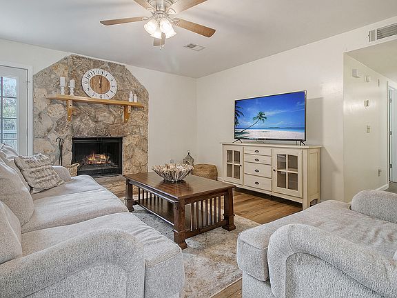 Charming and fully updated in 2020, 206 Village Green Circle boasts a prime location and is move-in ready!Nestled in the Village Green neighborhood of Sangaree, this home offers convenient access from both Royal Road and LongLeaf Road, and best of all, there are no HOA fees to worry about.The curb appeal is undeniable, featuring a generous yard and inviting archways that frame the front porch.The front door opens into a foyer with a coat closet. Just off the foyer is the kitchen. To the right, you'll find the well-appointed kitchen, while a hallway to the right leads to the bedrooms and bathroom. The living room is situated to the left. Throughout the main living areas, you'll appreciate the stylish vinyl plank flooring. (MORE)Additionally, the home is equipped with a Ring security system and an Ecobee thermostat. The living room features a ceiling fan and a large stone fireplace with raised hearth and mantle. A back door conveniently connects to the backyard. The galley kitchen boasts granite countertops, a complementing backsplash, a ceiling fan, and upgraded stainless steel and black appliances, with the refrigerator included. Adjacent to the kitchen and living room is the quaint dining area. Just down the hallway are three bedrooms and a full bathroom. The bedrooms include ceiling fans. The full bathroom is spacious with room for additional storage. The backyard can be accessed by doors in the living room and garage. The living room backdoor opens onto a concrete patio. The backyard is spacious with enclosed privacy fencing. The back gate opens to a large drainage buffer, adding additional privacy. In addition to the updating completed in 2020, the home also has new duct work (2021) and a new heat pump (2020).