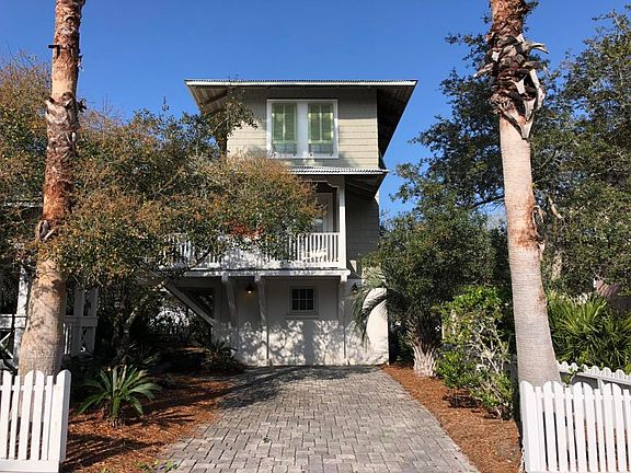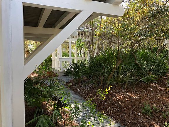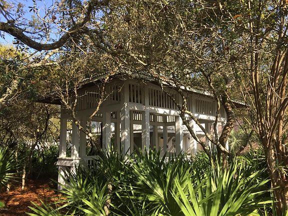 Exquisite 3 bedroom Guest House - the only 3 story guest house allowed in the interior of Carillon Beach. It has 1/3 more square footage than other guest houses and has wonderful architectural detail with great use of space on a large lot! On the 1st floor, you will find arched hallway doors leading to 2 bedrooms, a washer/dryer, and a bathroom that leads to an enclosed outdoor shower. On the 2nd level, the nicely laid out kitchen, living, and dining space, along with the wrap around porch, are surrounded by mature trees. A large master bedroom with an open beamed ceiling and master bath complete the 3rd floor. The beautiful private yard with gazebo, paths, and garden shed give plenty of outdoor living options. There is room to build a large main house with a tower on this property.