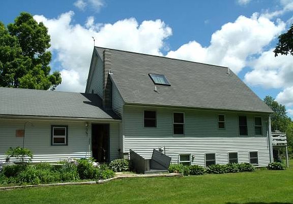 Lovely, well-landscaped grounds with fruit trees,several garden areas and perennials situated on two, very inviting, level acres enhance this two bedroom, 1.5 bath Contemporary Cape. Boasting an open concept floor plan with cherry cabinets in the kitchen, tile counter and floor, ample cabinet space plus the benefit of a walk in pantry. The living room has hickory flooring and cherry and knotty pine walls. The first floor master bedroom and a den/office lead out to a spacious deck that overlooks the back yard. The loft area bedroom with 1/2 bath and walk-in closet could also be utilized as the master. The lower level has a finished room presently being used as an art studio. The large workshop space (13.5'x37')is amazing and there is a utility room, with washer/dryer hookups. There is a two-car attached garage, an outbuilding, shed and a patio area off the kitchen. Located in a country setting, close to commuting routes and shopping. This is a home with many uses for the hobbyist/etc.