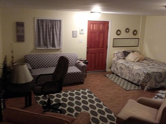 Fabulous Deluxe Studio Cottage with double bed area with large dresser. Living room area with pull out sofa , 1 comfy chair, desk with TV and cable. Large separate kitchen and large bathroom. (kitchen table and all pots and dishes needed inc.)Area to grill out and park next door in a beautiful quiet safe neighborhood. Renter pays electric. Pre pay fee, very reasonable. Owner pays Wi-Fi, cable, water, sewer, trash. Requires last month's rent.
