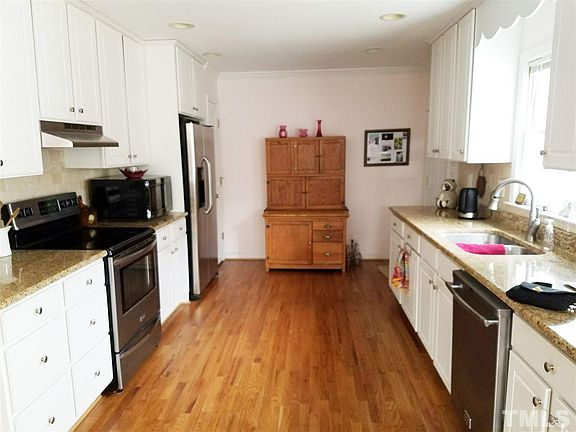 Charming 3 bedroom cape cod for sale in Cary, NC. This move in ready home is on a quiet cul de sac near downtown Cary. Recently renovated kitchen with granite countertops and bathrooms with tile. Hardwoods throughout. First floor master. Lots of storage space in extended garage, walk in closets and attic, plus backyard shed. Wood burning fireplace. Washer and dryer convey. Attractive yard with a fenced backyard, mature gardens, and a shed. Walk to shops and restaurants.