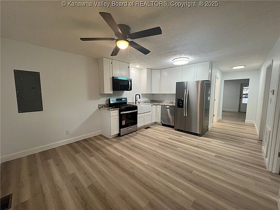 You'll fall in love with this beautifully updated two-bedroom, one-bath home! The perfect blend of modern comfort and cozy living, this charming home welcomes you with a spacious living room featuring a brick fireplace and custom made mantle. A wide hallway leads to two comfortable bedrooms, a full bath with a convenient laundry area, and an open kitchen equipped with brand new appliances, cabinetry, flooring and countertops. Enjoy outdoor living on the covered back porch overlooking a generous yard that offers space for parking or play! Additional features include a storage building and brand new HVAC system- move in ready and waiting for you!