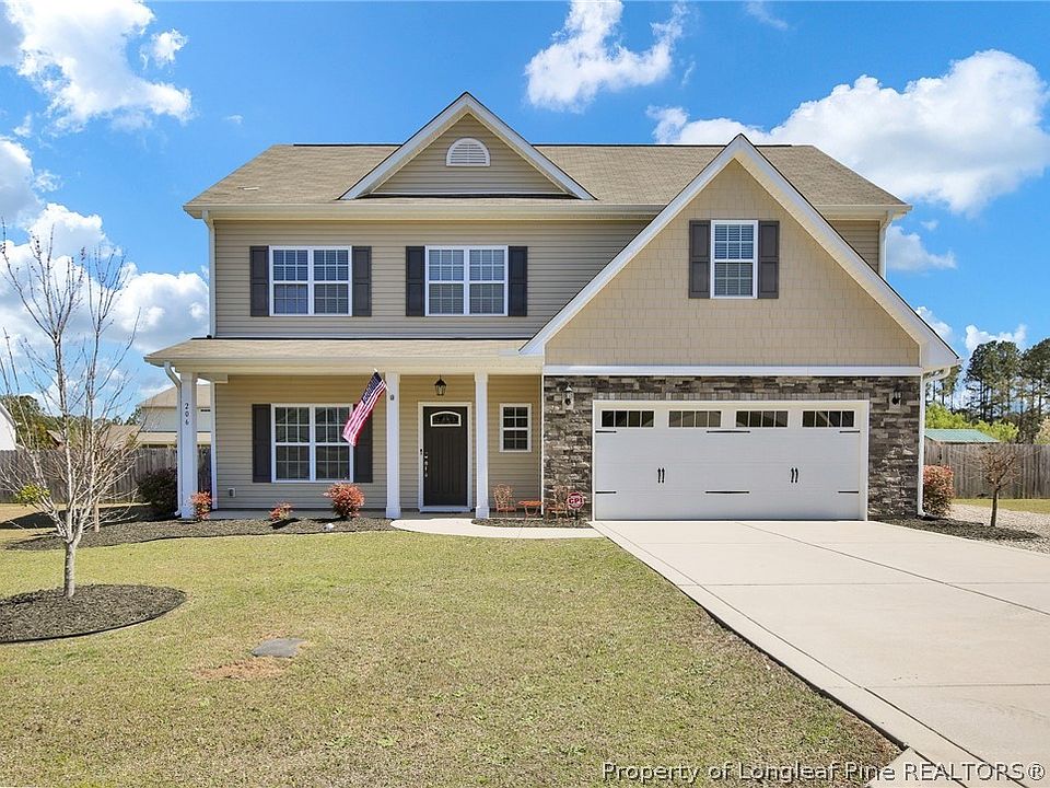 Welcome home to this immaculate freshly painted three bedroom home with large bonus room and two car garage. The third floor could be finished to add additional square footage and equity! Home offers attractive stone accents, a nearly half acre lot with privacy fencing and screened in back patio. The main level provides a formal dining room, butlers pantry, kitchen with ample cabinet and counter space, large great room with fireplace, and an upgraded half bathroom. The second level offers an oversized primary bedroom suite with large walk in closet and ensuite bathroom. Two additional bedrooms share a full bathroom and large laundry room offers a folding station. The bonus room with built in shelving completes the second level. Home is located in Stedman and less than 10 miles down country roads to downtown Fayetteville and home is on public water utilities.