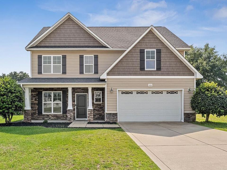 Welcome to this beautifully designed 4-bedroom, 2.5-bath home offering 2,471 square feet of thoughtfully crafted living space, plus an additional 672 sq ft of unfinished third-floor walk-up ready for future expansion—already prepped for HVAC! With a septic system permitted for 5 bedrooms, there's room to grow. Step onto the pillar-lined front porch with stone veneer and into a bright, open interior featuring 9-foot ceilings on the main floor. The entryway leads to a dedicated office with elegant French doors—perfect for working from home. A massive great room awaits with a cozy fireplace and custom built-in bookcases, flowing seamlessly into the spacious kitchen featuring custom cabinetry, granite countertops, a large island, pantry, and a sunny breakfast area. Upstairs, all bedrooms feature walk-in closets. The luxurious primary suite boasts a tray ceiling, an oversized walk-in closet, and a spa-like bath with dual vanities, a soaking tub, a separate walk-in shower, and a private water closet. A versatile bonus room offers the option for a 4th bedroom or flexible living space, and the second-floor laundry room includes a custom folding station for added convenience. Outside, enjoy a huge fenced-in backyard with a shaded play area under mature trees and a covered patio ideal for relaxing or entertaining.