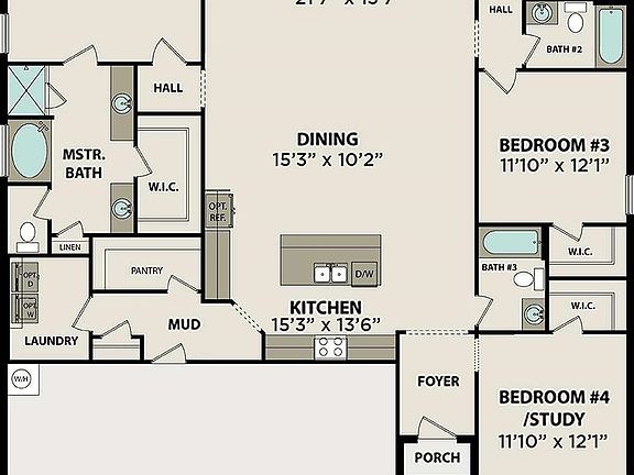 Within The Lanier’s charming, full-brick exterior lies four bedrooms and plenty of space. The three-car garage leads into the home’s mud room. The kitchen features a large pantry, double-sided island and more than enough counter space. Once there you’ll discover the home’s biggest feature – the huge, open-concept layout. The combined family room/kitchen/dining room are perfect for entertaining, and the plan’s Master Suite is to-die-for. Read your favorite novel in the Master Bedroom’s gorgeous sitting area or discover the Master Bath’s split sinks and large walk-in closet. The fourth bedroom can also serve as a home office, and the covered porch offers a quiet escape to the outdoors.