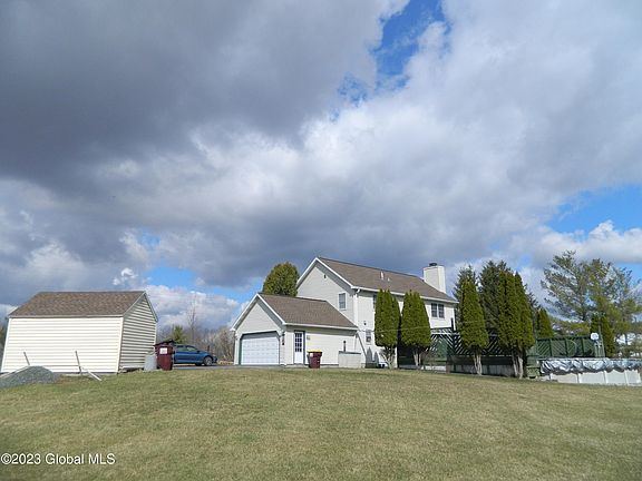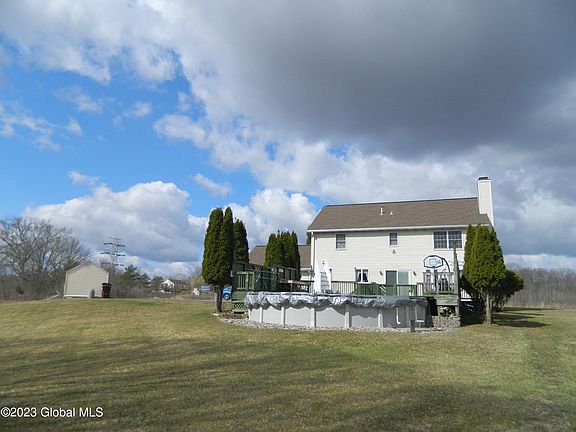 Immaculate Colonial on 2 acres in a quiet country setting, on a dead-end street. This home features a great first floor layout, eat-in Kitchen with stainless appliances, dining area overlooking deck & yard. Large Formal dining room. Extra spacious living room w/ fireplace. Guest powder room. Enjoy BBQ this summer on the large deck w/above ground pool.2nd floor features Huge Primary suite w/double closets in dressing room area w/ vanity , separate from shower. Two Nice size guest bedrooms & large full bathroom with double vanity. Full finished basement w/family room, desk/office/craft area. Separate laundry room. Attached oversized garage with tons of shelving & storage. Shed. New Roof, Central A/C. Nice flat lot with gorgeous views of trees and mountains. award winning Schodack Schools