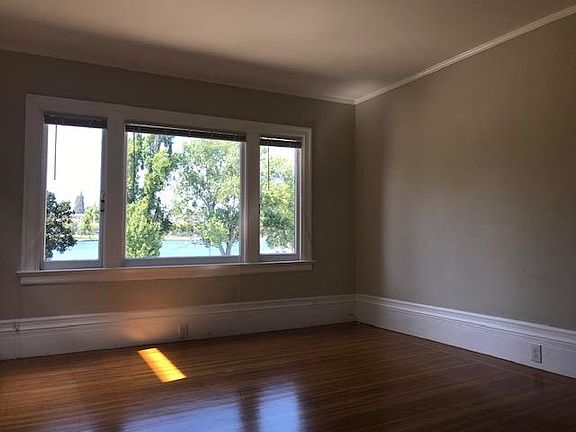 This lovely, light-filled apartment with spectacular views of Lake Merritt is on the lower floor of a 5 unit complex. The two bedroom, one bath unit has a living room with fireplace, updated kitchen and bath, hardwood floors and large walk-in closets. The apartment comes with two assigned parking spaces, one in the attached garage and one on the driveway. A coin-operated washer/dryer and a sunny garden are available for all the residents. The building is close to freeway access, public transportation (bus and BART) and downtown Oakland. It is within easy walking distance of Trader Joe's, Lucky's, the Grand Lake Theater, Saturday Farmer's Market and other Grand/Lakeshore Ave shopping and dining. Lake Merritt is across the street for walking, boating, biking, picnics, etc. Photo ID, very good credit, positive employment and rental references are required. Owner pays water and garbage, resident pays gas/electric. Additional $500 deposit per cat. This is a non-smoking property.