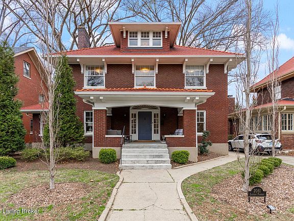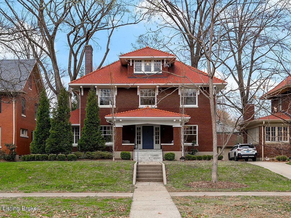 An architectural charmer just steps from Cherokee Park awaits a new owner to love it! This residence has only been inhabited by two families since it was built in 1920. In many ways, this home emulates the classic Highlands four square design, but in other ways it has its own personality. The curb appeal is on point with its sweeping front porch as it is perched on a small knoll overlooking the parkway. Upon entering, one is captivated by the architectural details, trim-work, moldings, archways and the not to be missed impressive staircase. The formal dining and living rooms flank the entry foyer. The living room spans the home from front to rear and has a handsome fireplace and windows that showcase the views in every direction. On the other side of this room is the sunroom. The current owners use this space as a playroom but it could be used as a home office, art/yoga/meditation studio as well as many other possibilities. The dining room flows seamlessly into the butler pantry and kitchen area which are simply waiting for your personal touch. Just off the kitchen one will find a sunny breakfast room and a guest half bath. The dramatic staircase to the second floor can be approached from two sides of the home. The primary suite is at one end of the hallway and has a fireplace, windows on two sides, walk in closet room (could also be a nursery or office) a separate closet and entrance to the full bath. There are also two large bedrooms and a cozy office/ reading room. The end of the hallway has a classic linen press providing storage, steps to the top shelf and more. The third floor has its own mini split heating and cooling system keeping the rooms comfortable. There is a room that could be used as a bedroom, teen suite, bunk room or craft room with and offset TV room. The attic provides additional storage and is easily accessed through doors on the third floor. The walkout unfinished basement has the laundry and workout areas as well as storage and play area. A detached two car garage lies at the back of this generous rear lawn. This is truly a gem in the Highlands and in a primo location!