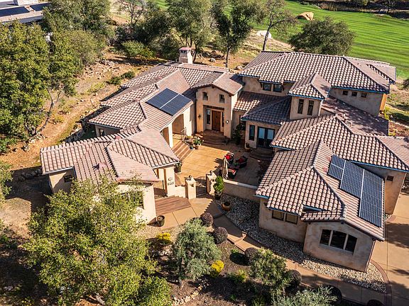 Tuscan Elegance on the 18th Fairway at Winchester Country Club! Experience the charm of 17th-century Italy blended with modern luxury in this stunning Tuscan-style estate overlooking the 18th fairway of Winchester Country Club. Spanning 5,236 sq. ft., this four-bedroom, six-bath home offers breathtaking golf course and foothill views. Step inside to arched doorways, hand-troweled plaster walls, open-beam ceilings, and rich hardwood and tile floors accented by stonework and fine finishes. The gourmet kitchen features Viking and Bosch appliances, antique-glazed cabinetry, and chiseled granite countertops. The primary suite includes a vaulted ceiling, stone fireplace, and spa-like bath with heated marble floors, jetted tub, and dual copper sinks. Upstairs, enjoy a game/theater room with wet bar and a balcony with panoramic views. A private casita offers space for guests or an office. Outdoor living includes a courtyard, covered patio, outdoor kitchen, spa, and fountainall overlooking the fairway on a 1.10-acre lot. Additional features: owned solar, Generac generator, wine cellar, and four-car garage. A true masterpiece of elegance and comfort in a premier golf course setting.