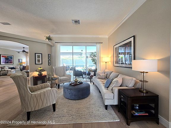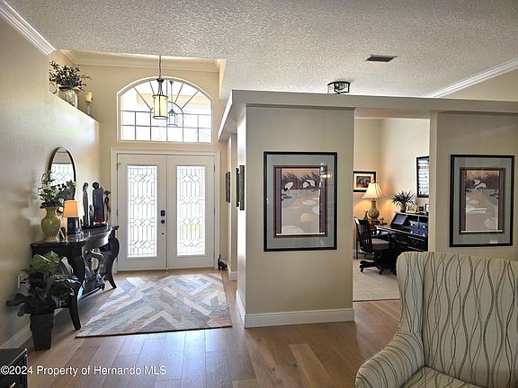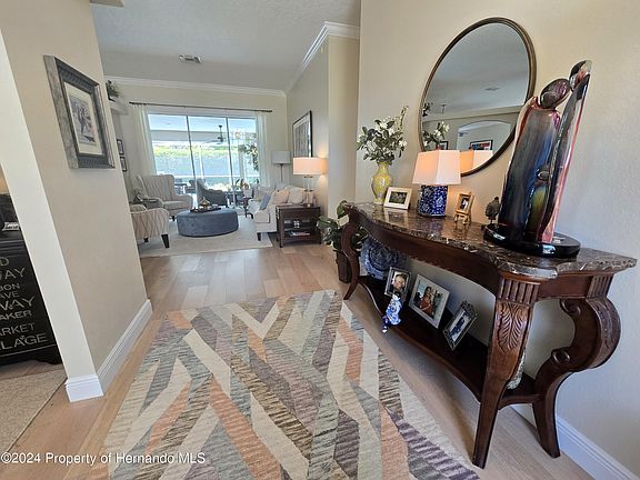 Wait no longer! This stunning well-maintained 3 bedroom, 2 bath, plus separate office or den area, pool home has a 3-car garage that you've been waiting for. It has been recently renovated throughout with new luxury bleached oak plank flooring. High ceilings allow natural light to flow through the spacious floor plan. The Eat-in kitchen has a farmhouse sink and stainless steel appliances featuring quartz countertops, subway tile backsplash and white-painted cabinets that overlook the family room for entertaining friends. The main suite features 2 large his/her closets, an oversized walk-in shower with luxurious floor-to-ceiling tile, a granite double sink vanity and jacuzzi tub and a water closet with a door for privacy. A dream of a laundry room has lots storage cabinets, a closet, and a washer and dryer. Utility sink in garage. Enjoy the covered screened-in in-ground pool that has been resurfaced and with new pavers, pool heater 2022 and salt cell replaced in 2023. Lovely landscaping includes an irrigation system around the home. HVAC 2019, roof 2016, and water heater 2018. Call to see it today! Timber Pines is located close to the Gulf of Mexico with easy access to major highways to Tampa, St. Petersburg, and Orlando. International airports, gulf beaches, shopping and nightlife are all nearby. Enjoy the resort-like atmosphere that Timber Pines has to offer. Timber Pines, a 55+ Gated Community, With 4 Golf Courses, a Country Club, a Remodeled Restaurant And Bar With Multiple TV Screens, 2 Pools, a Fitness Center, Tennis And Pickle Ball Courts, Bocce Ball, Billiards Room, And More Than 100 Different Clubs. Spectrum Cable, 2 boxes, and High-Speed Internet Are Also Included In the HOA.